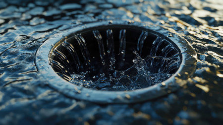 A drain with a metal grate and water on it, AI