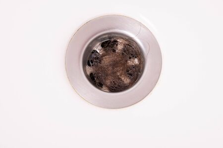 iron drain in the bathroom clogged with hair on a white background