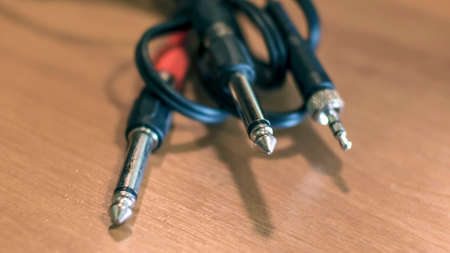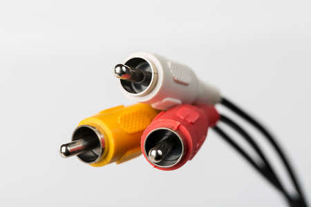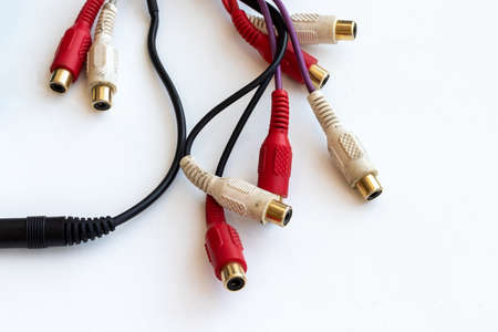 Dirty wires with black, red and white audio video connectors RCA jack on a white scratched work table