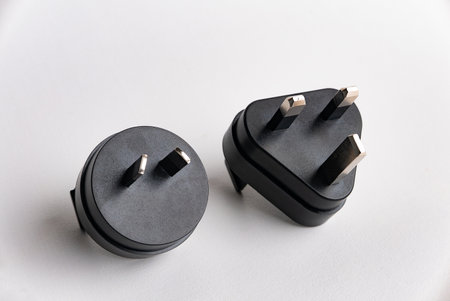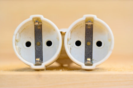plan view of plugs – Blurred background of three pin plugs with top of plug with test sticker