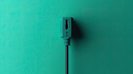 This image features a minimalist green wall displaying a single electrical outlet. A black cable protrudes, representing modern technology and domestic functionality in a clean environment.