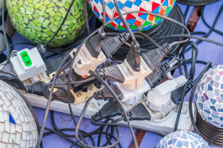 Old and damaged electric adapter power plug has many appliances are plugged outlet socket concept of risk danger overloaded current electrical. Overloaded power plugs, close up