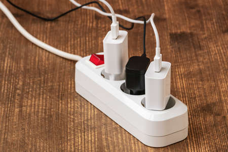White USB charging for gadgets on a blurred background of the room, close-up.
