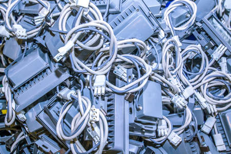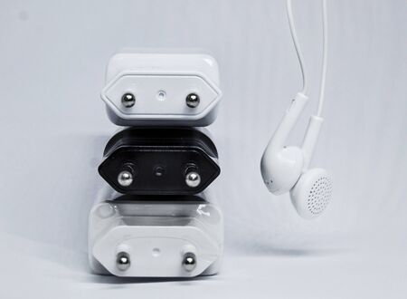 Electrical plugs from electrical appliances in white and black on a white background. View from above.