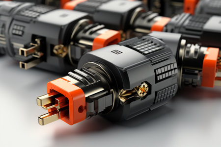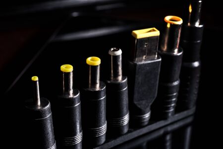 Several electro connectors on a black background shot in macro mode. Visible metal connectors of connectors.