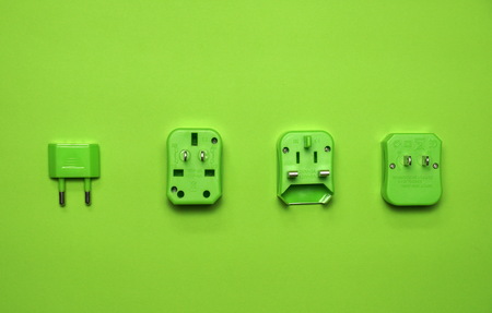 vivid green universal wall electric plug adapter aboard travel set for tourist monochrome photo