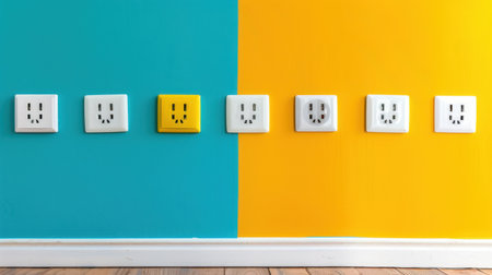 This vibrant image features multiple electrical outlets set against a striking blue and yellow wall, showcasing modern utility and stylish design.