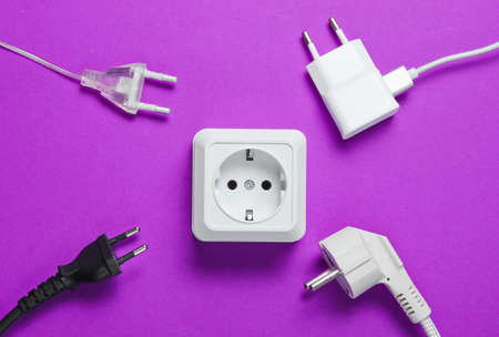 The concept of electrical dependence. Lots of power plugs near power outlets on purple background