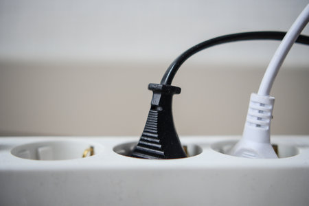Electrical plugs with cords connected to electrical power strip, electrical extension for appliances with On-Off switch.Concept of energy saving, network congestion.