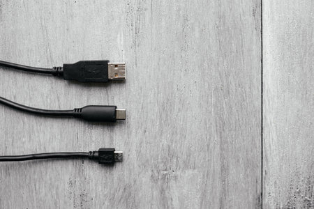 Different USB cables with different connectors on a white wooden background. USB type C, type A and micro usb.