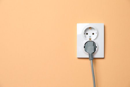 Double power socket with inserted plug on pale orange wall, space for text. electrical supply
