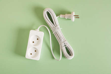 White electrical outlet sockets and power cords with power plugs on a light green background. Top view