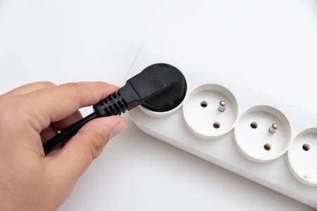 Manually plug the power cord into a white plastic or European power outlet. Closeup of a man hand inserting an electrical plug. Black background