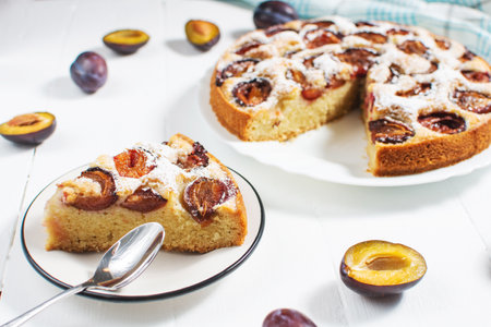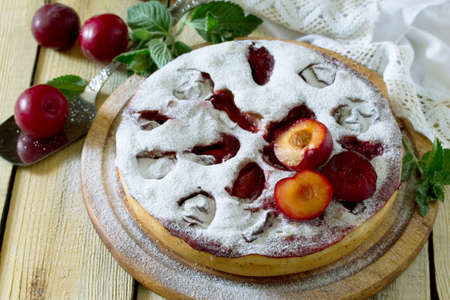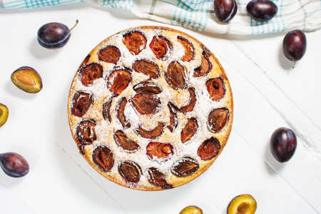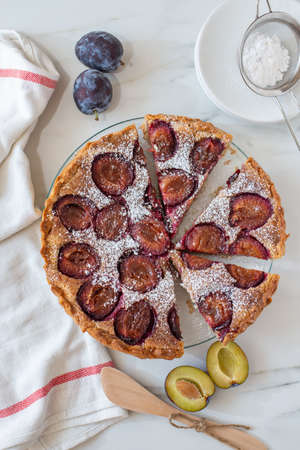 Homemade delicious plum tart with sugar powder on white wooden table.
