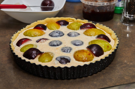 Preparation dessert plum pie on kitchen table. Top view.