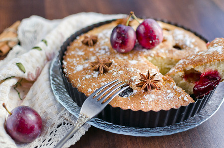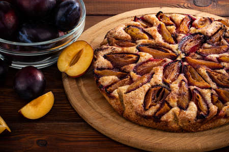 Close up homemade tart or pie with plums on plate on wooden background