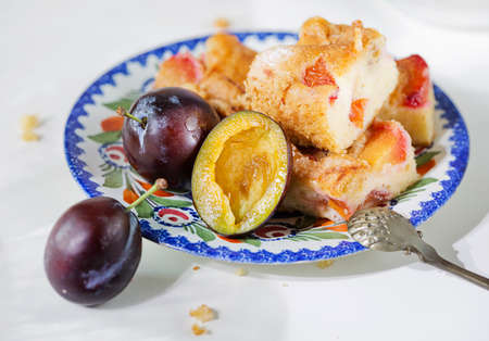 delicious homemade curd cake with red round plum close-up