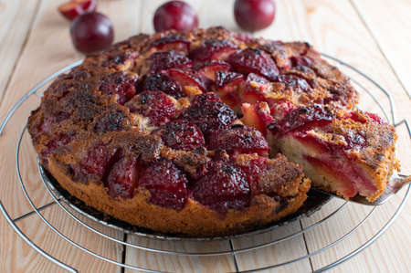 Rustic fruit cake with plums. Homemade fresh baked upside down plum cake served on a cooling rack isolated on wooden table.