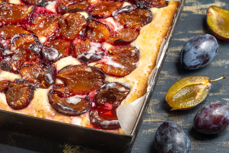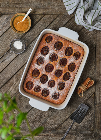 Cornmeal pie with fresh plums dusted with powdered sugar in a rectangular ceramic pan on a wooden background. Seasonal baking.