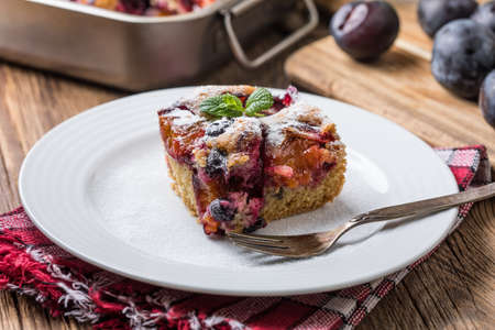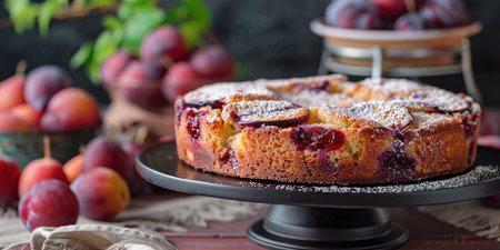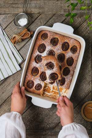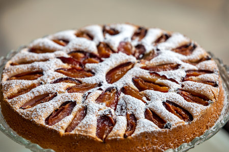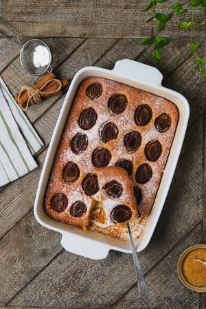 Delicious plum cake sprinkled with powdered sugar