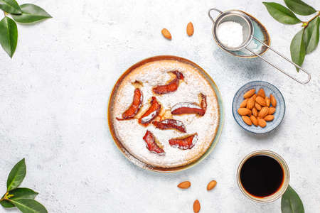 Homemade rustic plum cake with powdered sugar and almond,top view