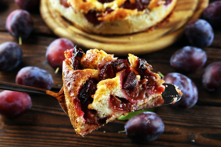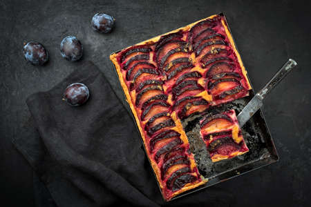 bavarian plum pie on dark wood