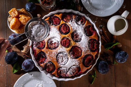 Damson blue plum clafoutis (flan) and cup of tea, icing sugar and almonds dressing, french cuisine on wooden background. Rustic style, top view