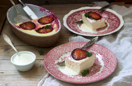 Cottage cheese plum casserole in ceramic form