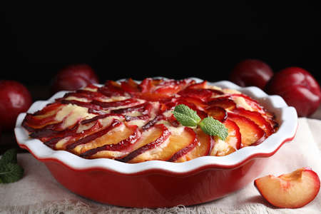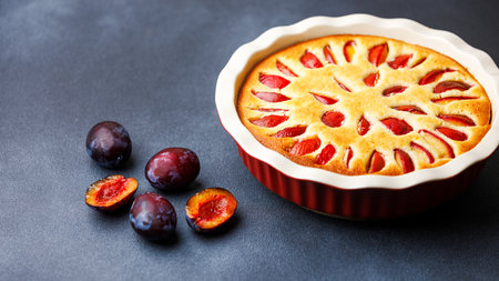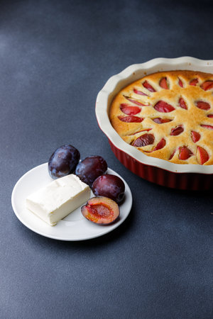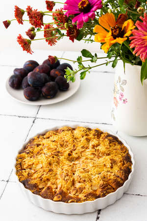 Homemade plum pie with almond flour in ceramic baking pan with fresh plums