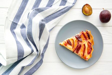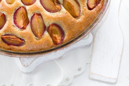 Homemade pie with plums on the white rustic table