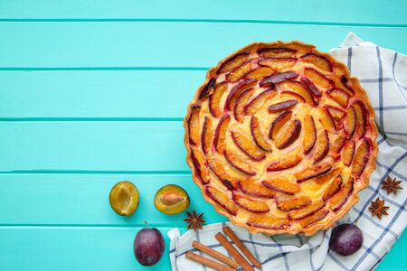 Autumn new york plum pie, tasty cinnamon spices plum torte cake on rustic cozy wooden background, copy space