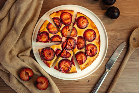 A round cake cut in slices with plums on a white plate on a wooden table, a top view