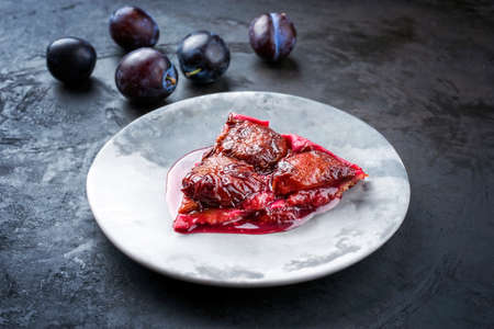 Pie with red plums. Peace on the plate and blurred background. Selective focus.