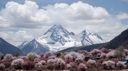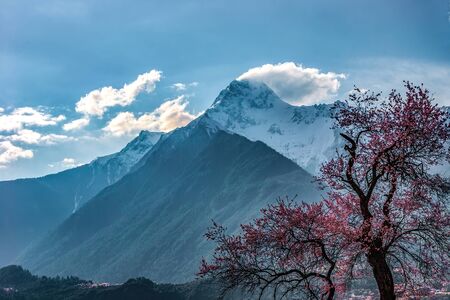 Peach blossom and snow mountain in Himalayas, Nepal