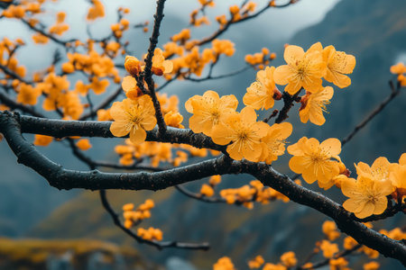 Delicate yellow flowers scatter across branches, showcasing their beauty against a blurred backdrop of mountains and traditional architecture, creating a tranquil atmosphere.