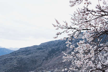 View of a flowering apricot branch on a cloudy afternoon on a background of gray mountains. The concept of plants, landscape, mountains