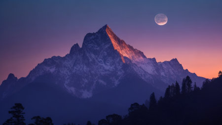 Experience the serene beauty of a majestic mountain peak draped in soft clouds at dusk. The light casts enchanting shadows on the snow-covered summit, inviting adventure.