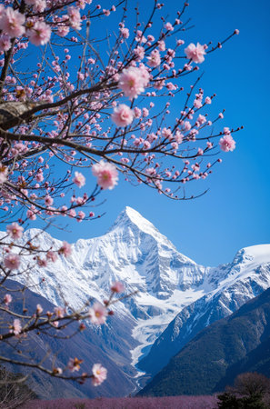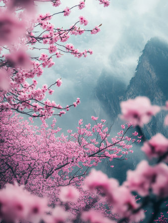 Cherry blossoms in soft pink hues bring beauty to the serene mountain setting, creating a peaceful atmosphere during springtime.