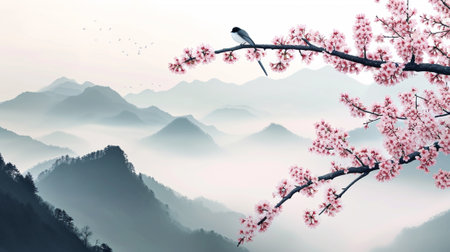 Blossoming sakura branch, little bird and misty mountains with gentle slopes