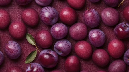 A visually appealing arrangement of fresh plums highlights their rich purple color and glossy texture, illuminated with soft light, perfect for culinary and health themes.