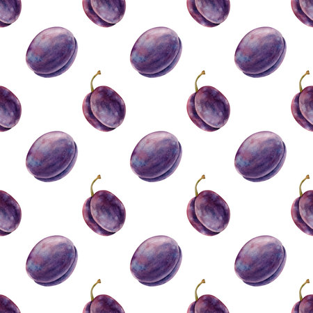 Seamless pattern with watercolor plums isolated on a white background. A hand-drawn botanical illustration. Seamless background with ripe fruits for wallpaper, packaging.