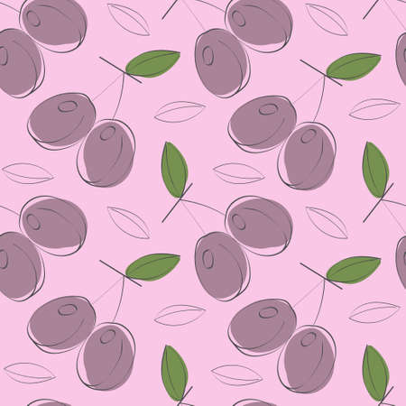 Plum seamless vector pattern on a pink background. Background for your design, packaging, wallpaper, fabric. Abstract image of cherries.
