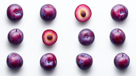 Whole and halved plums on a light yellow background, natural lighting, fresh and colorful,