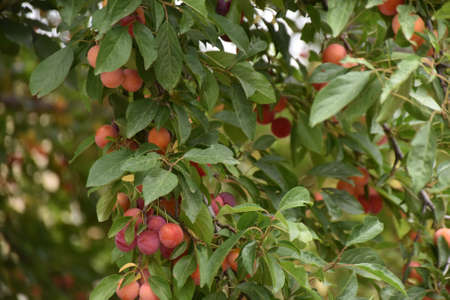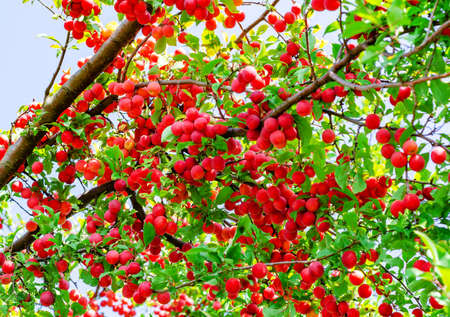 There are a lot of red cherry plum berries on the branches of the tree. Ripe fruit in the garden.