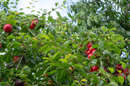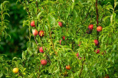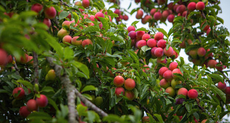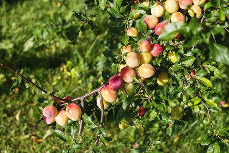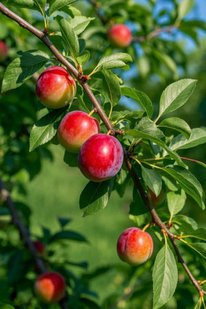 Healthy plums ripening on a young tree, rich in vitamins and antioxidants for a nutritious diet.