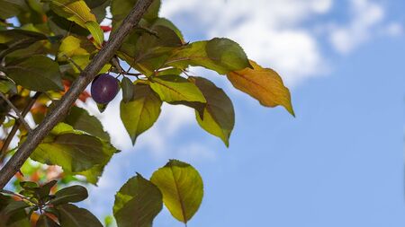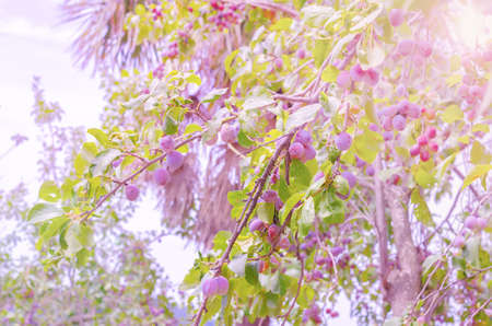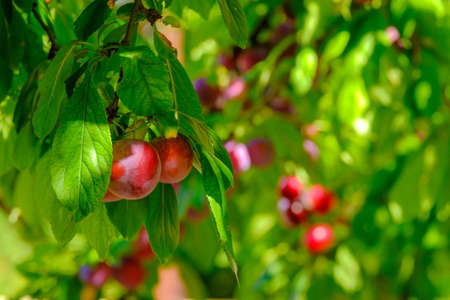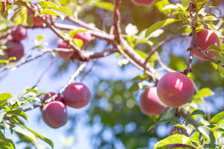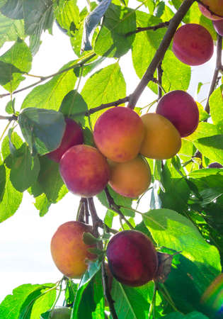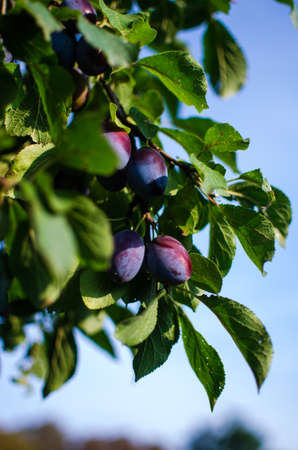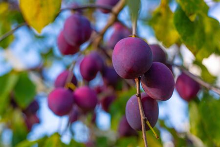Ripe plums on the branches in the garden on a sunny morning. Selective focus.