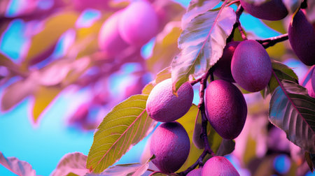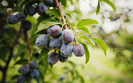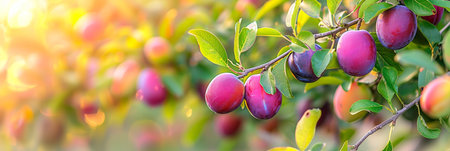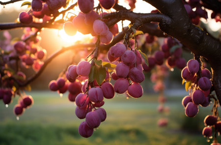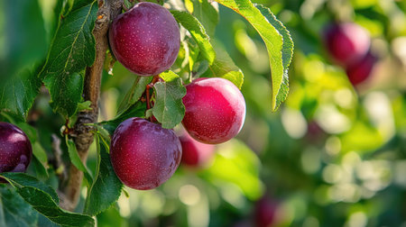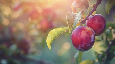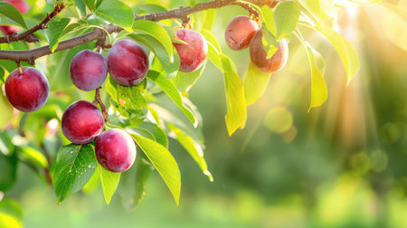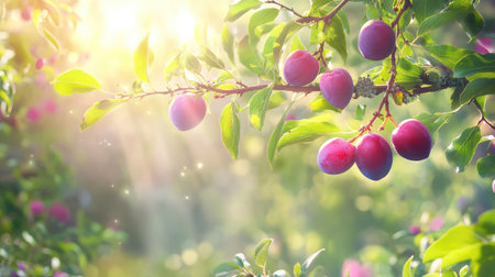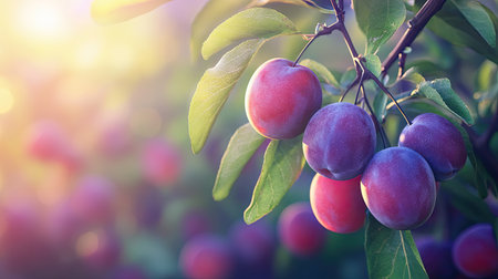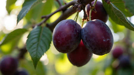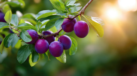 Lush plums dangle from a leafy branch, illuminated by gentle sunlight in a serene garden. This vibrant image captures the essence of nature's bounty.