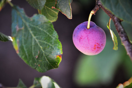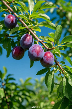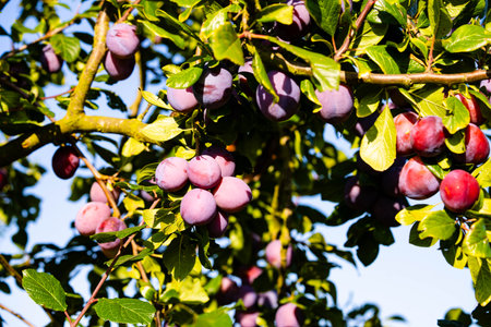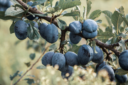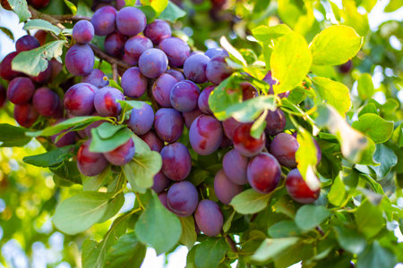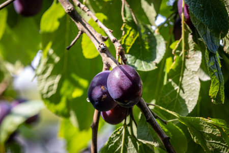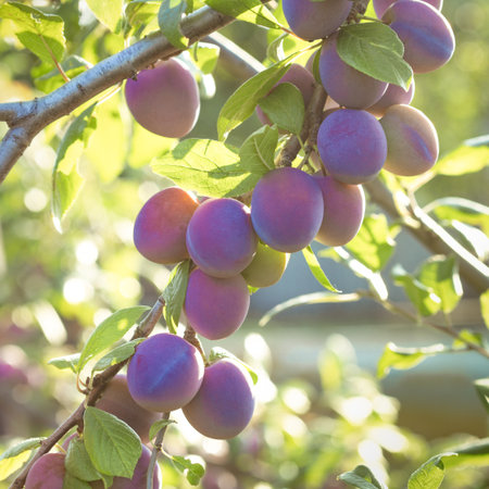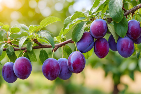 Juicy plums and crisp leaves on a sunlit branch, portraying a lush and well-maintained garden