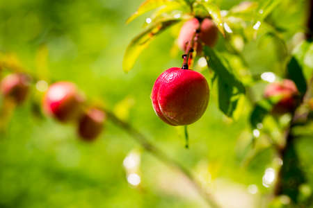 Red berry cherry plum on branches among green leaves. Harvest, healthy nutrition.