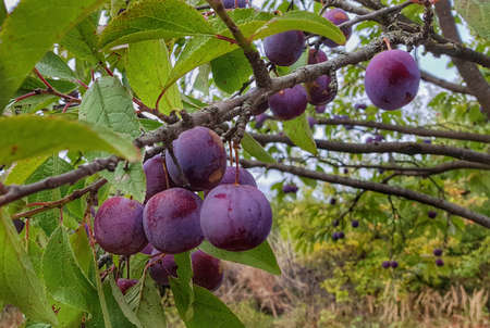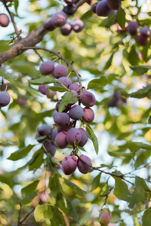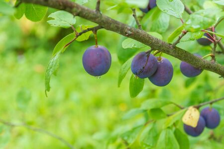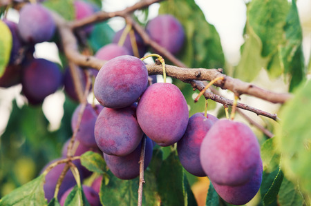 bunch of ripe plums on tree branch, Close-up. Organic farming, healthy eating,